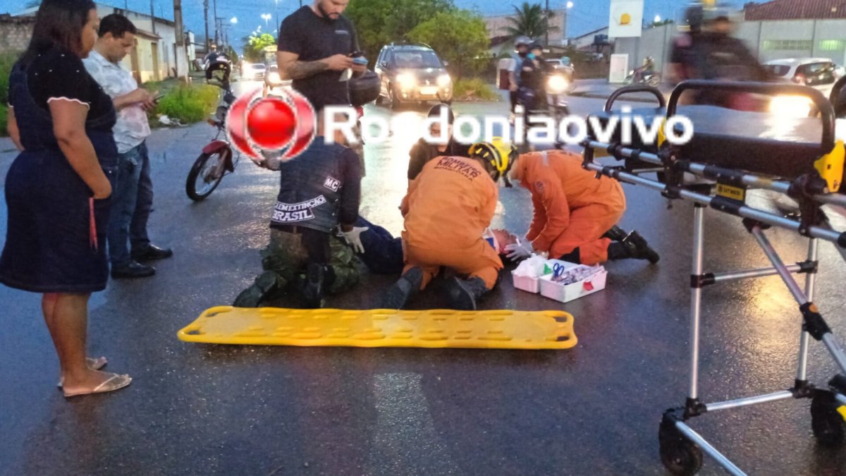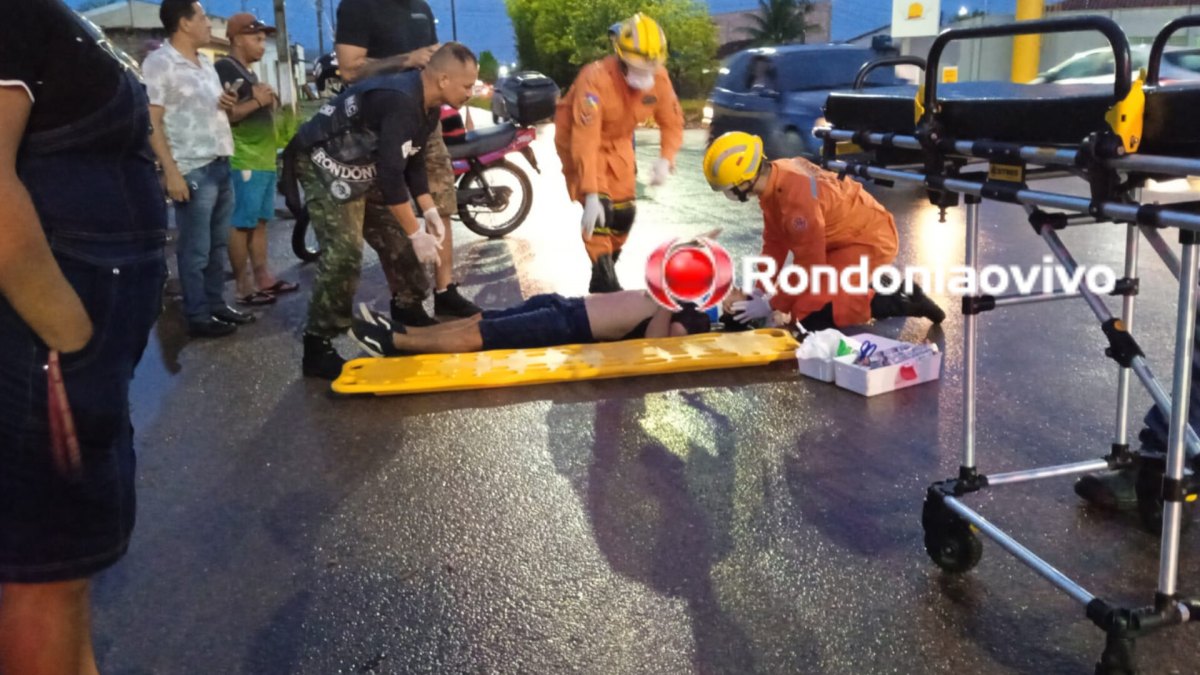 Após a forte colisão entre os veículos, o motociclista bateu com o rosto no asfalto e ficou seriamente ferido, inclusive com sangramento pela boca.