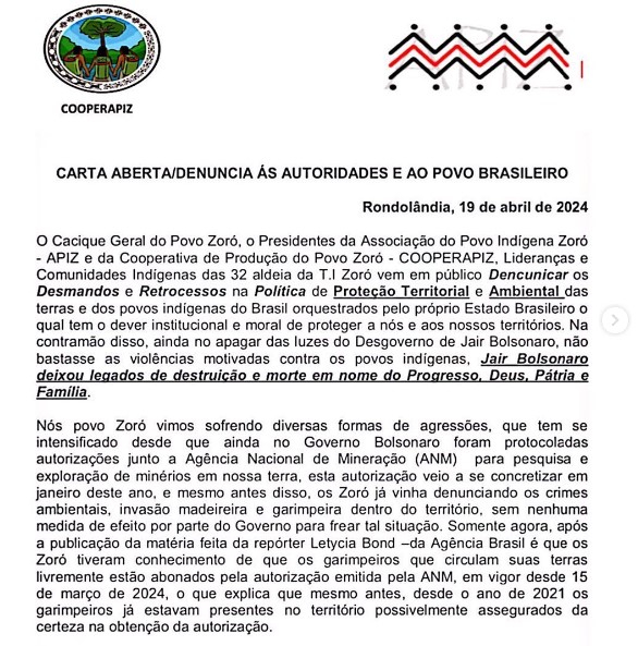 A carta aberta às autoridades e ao povo brasileiro foi assinada pelo cacique-geral do Povo Zoró, o presidente da Associação do Povo Indígena (APIZ) e da Cooperativa de Produção do Povo Zoró (Cooperapiz), lideranças e comunidades indígenas das 32 aldeias da TI Zoró e divulgada pela ONG Rioterra.
