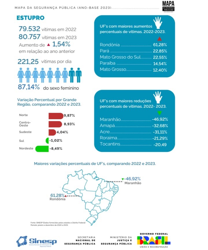 Três estados registraram um aumento no número de casos de estupro no último ano em relação a 2022: Rondônia teve um acréscimo de 61,28%, enquanto Pará e Mato Grosso do Sul apresentaram aumentos de 22,85% e 22,55%, respectivamente.