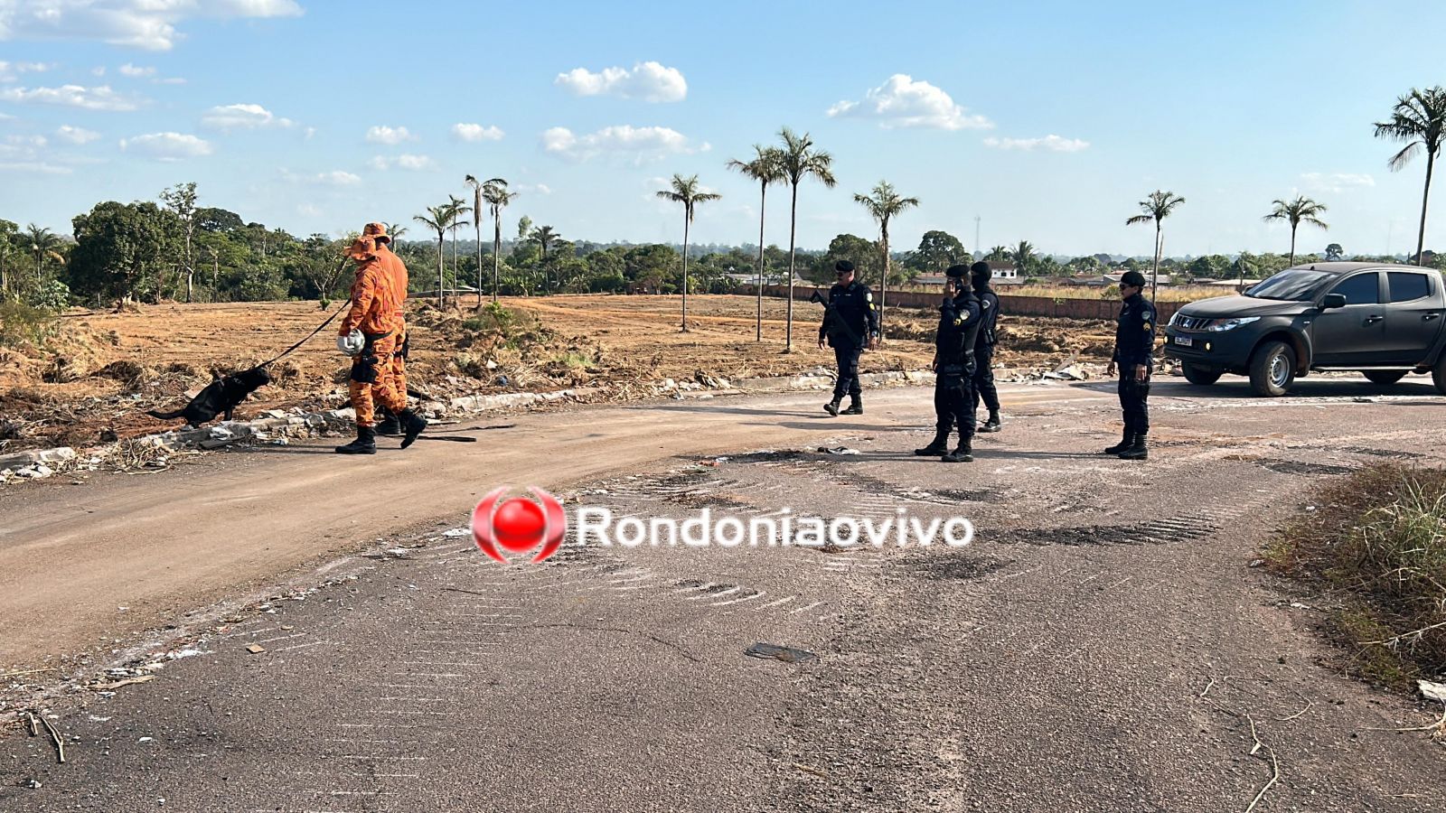 Com apoio de um helicóptero e uma cadela farejadora dos Bombeiros, equipes da segurança pública fizeram buscas em uma região de mata nos fundos do condomínio Morar Melhor, mas sem êxito em encontrar.