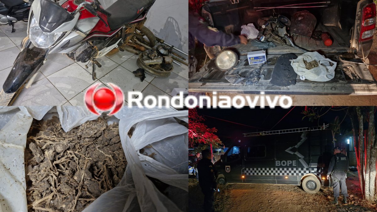 No local, os policiais encontraram drogas, uma moto furtada, que já estava sendo desmontada, e três emulsão explosiva. Policiais militares do Esquadrão Antibombas tiveram que ser acionados para fazer a remoção dos explosivos (banana de dinamite).