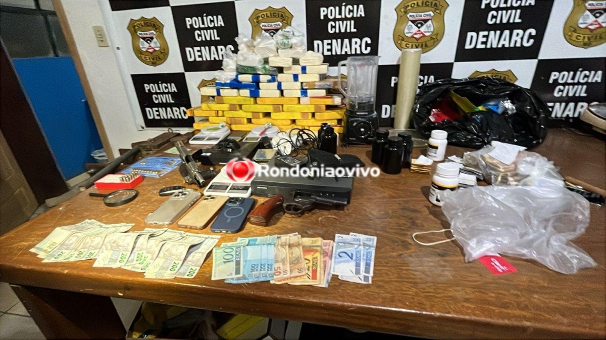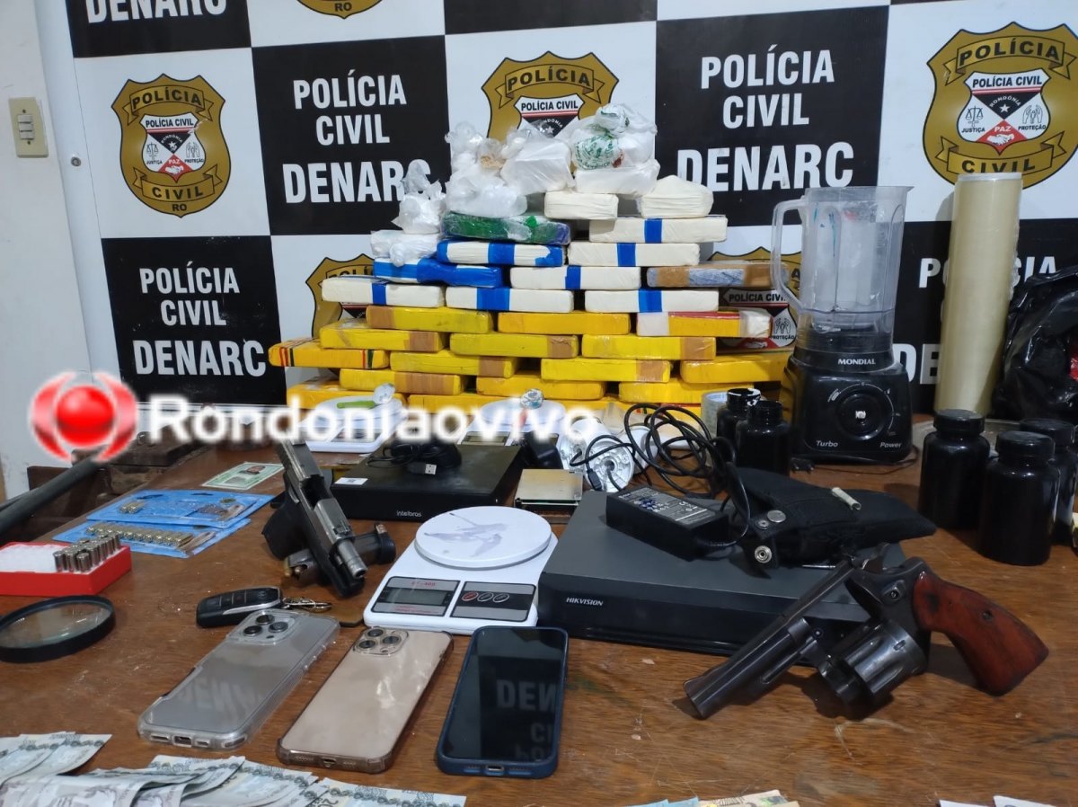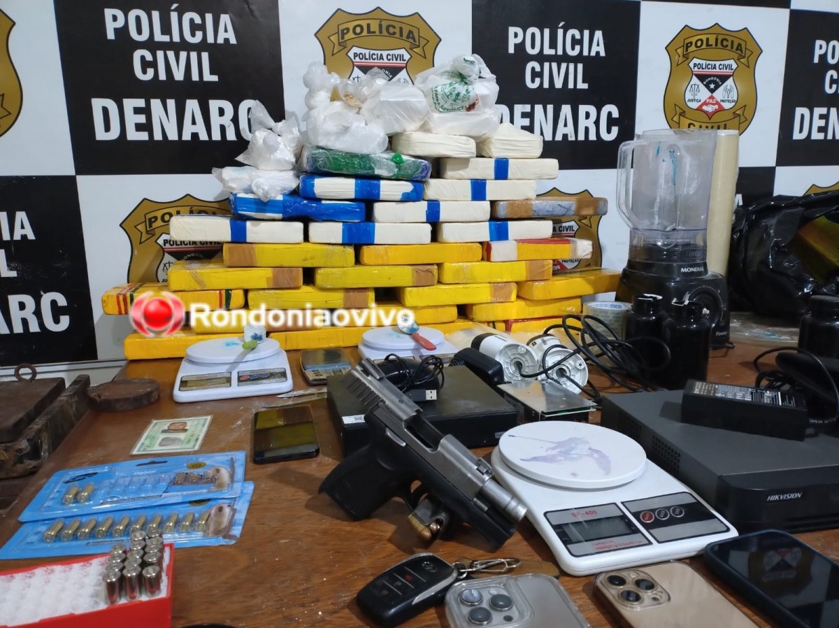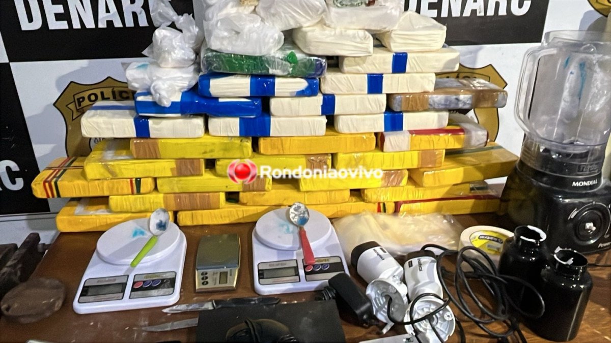 No imóvel, foram apreendidos 30 quilos de cocaína, porções da mesma droga, balanças de precisão com resquícios de entorpecentes, várias embalagens com resquícios de droga, copo de liquidificador com resquícios, câmeras de monitoramento do laboratório, TV, prensa hidráulica, recipientes com cafeína usado pra dar mais volume de droga e demais apetrechos.