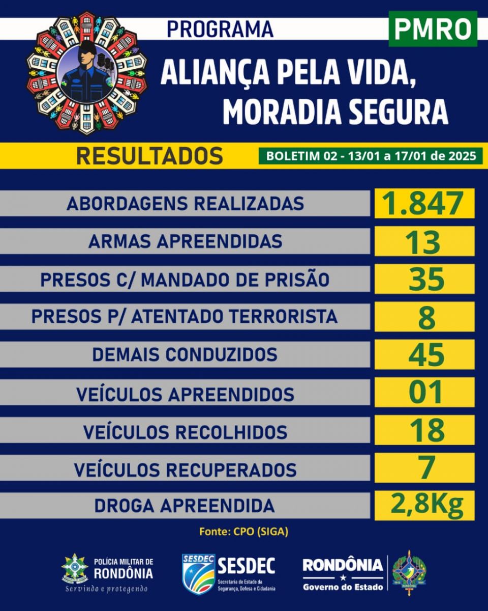 A Operação, denominada “Aliança pela Vida, Moradia Segura II” desenvolvida no residencial Orgulho do Madeira, zona Leste da Capital, além do reforço no policiamento em outros bairros de Porto Velho e localidades do estado, reúne forças policiais estadual e federal que estão atuando em conjunto para maior segurança da sociedade. No Orgulho do Madeira, os moradores estão se sentindo mais seguros desde as ações de combate à criminalidade.