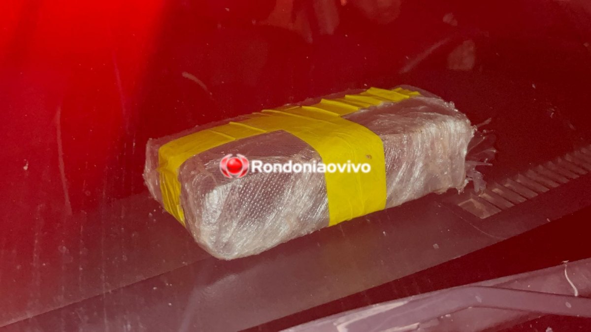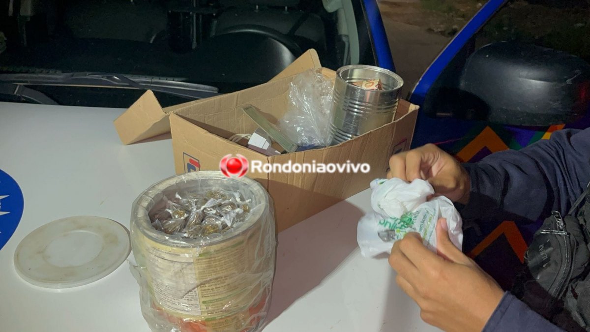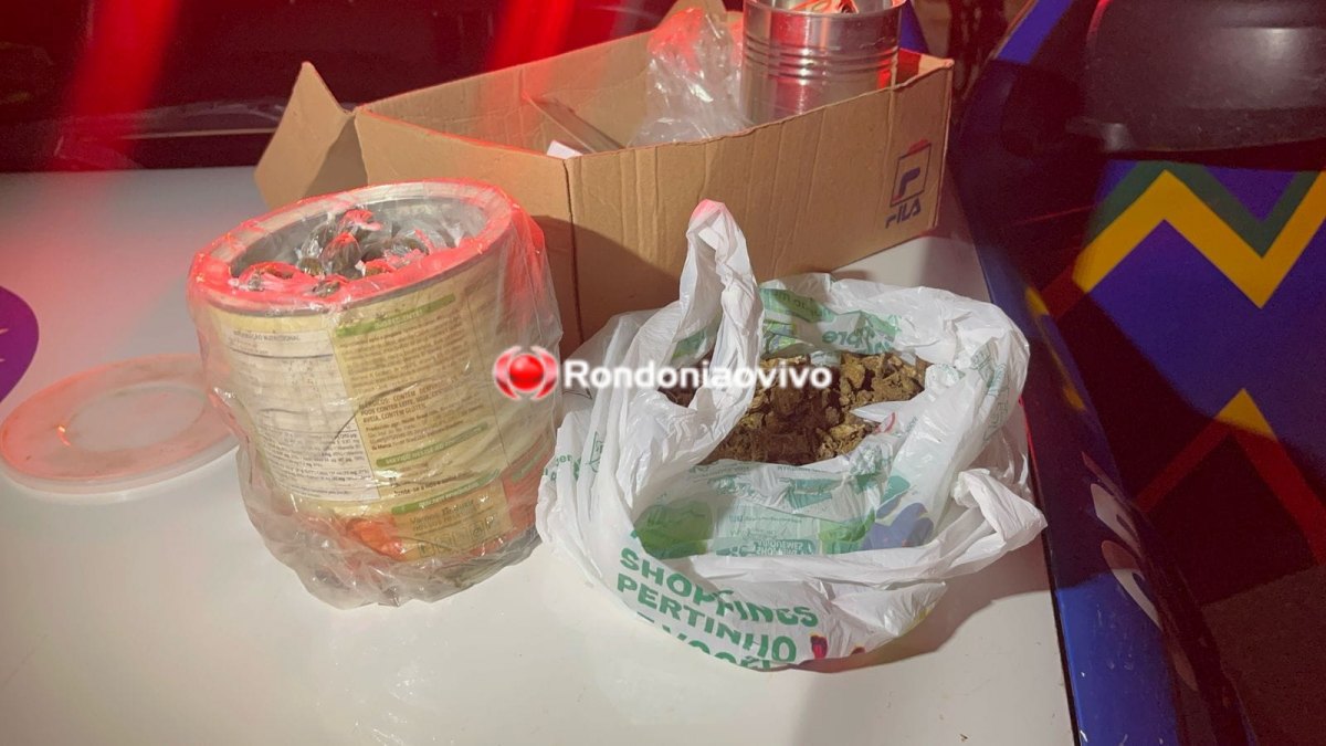 Durante revista, os policiais encontraram um tablete de maconha com aproximadamente um quilo e diversas outras porções da mesma substância.