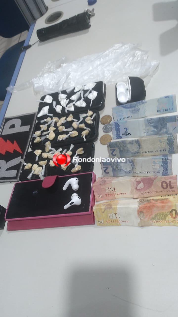 No local, os policiais apreenderam mais de 40 porções de cocaína e crack, dinheiro trocado, materiais usados para embalar droga, celulares e outros objetos de procedência duvidosa.