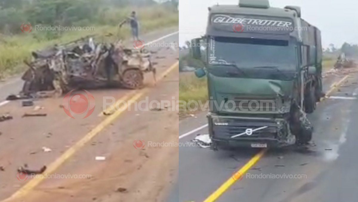 O carro bateru de frente com a carreta e ficou completamente destruído na rodovia.