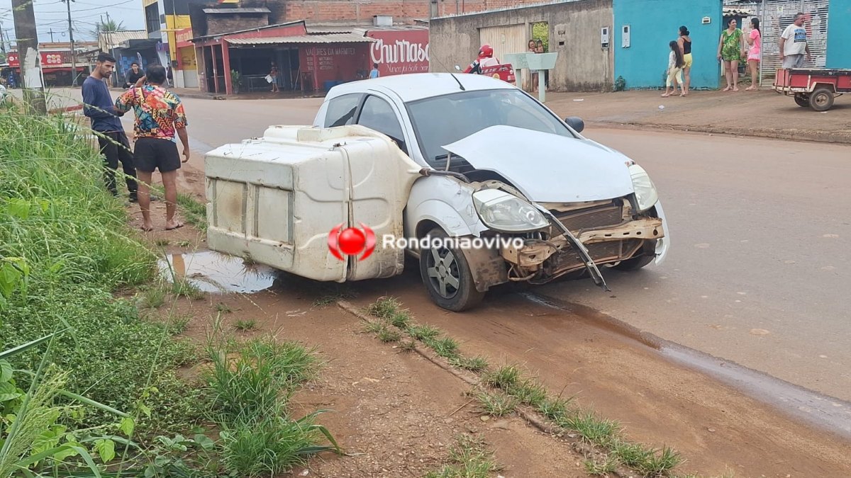 Um carro modelo Ford Ka que seguia em direção a Avenida Guaporé foi atingido pela "carretinha" desgovernada, que quase entrou pelo parabrisa do veículo, o que poderia acertar o motorista em cheio.