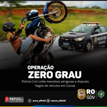 A Polícia Civil de Rondônia, na data de hoje, realizou a operação denominada “Zero Grau”, com o objetivo de coibir a prática de “rolezinhos”, manobras perigosas conhecidas como “grau” e disputas automobilísticas ilegais, popularmente chamadas de rachas. A ação consistiu no cumprimento de mandados de busca e apreensão, fundamentados em denúncias e levantamentos técnicos de inteligência, resultando na apreensão de automóveis e, principalmente, motocicletas utilizadas por condutores que reiteradamente praticavam infrações de trânsito, colocando em risco a própria integridade física e a de terceiros.