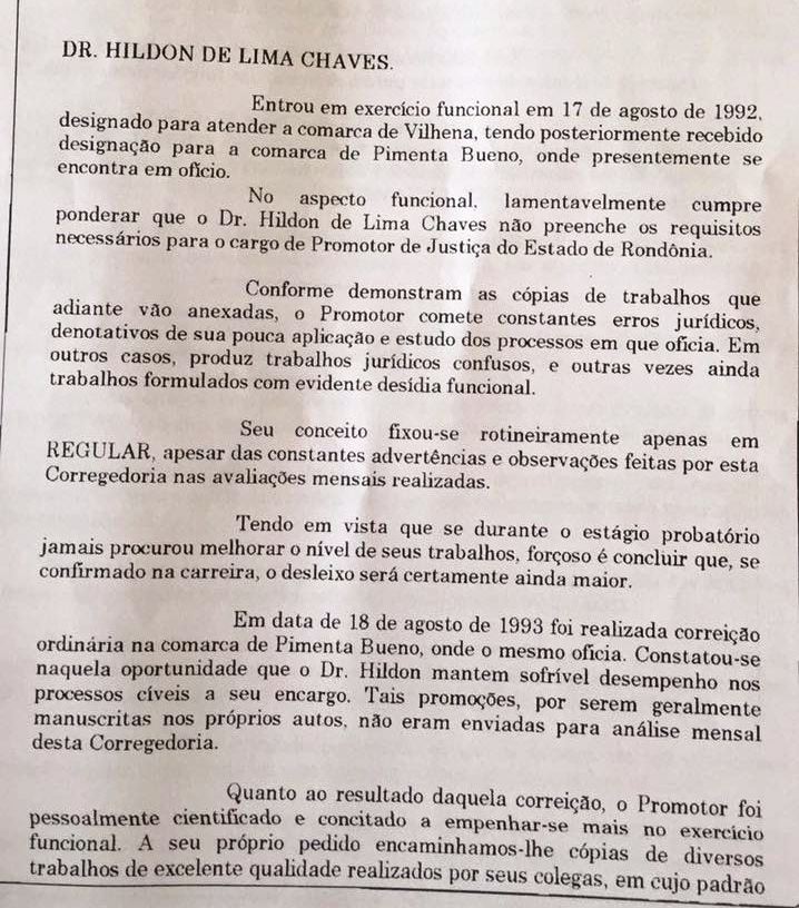 Em relatório final da Corregedoria do Ministério Público, datado de 13 de junho de 1994, sobre o estágio probatório do então recém-empossado Hildon Chaves, sua conduta como “fiscal diligente da lei” foi reprovada, com a recomendação que o mesmo não fosse declarado ‘vitalício’ no cargo.