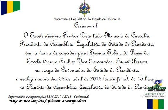Constitucionalmente, a posse de governador é realizada pela Assembleia Legislativa. Por isso, o presidente Maurão de Carvalho (MDB) agendou sessão solene de posse para esta sexta-feira (6), às 15h, no Plenário das Deliberações.