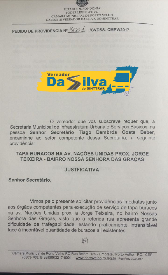 Mais um pedido, que foi realizado pelo Vereador Da Silva do Sinttrar (PSB), foi atendido esta semana. Se trata do pedido de providência nº 3001/2017, que foi solicitado à Secretaria Municipal de Infraestrutura Urbana e Serviços Básicos do Município de Porto Velho (SEMISB) para que realizasse o serviço de tapa-buracos na Av. Nações Unidas, próximo a Av. Governador Jorge Teixeira.