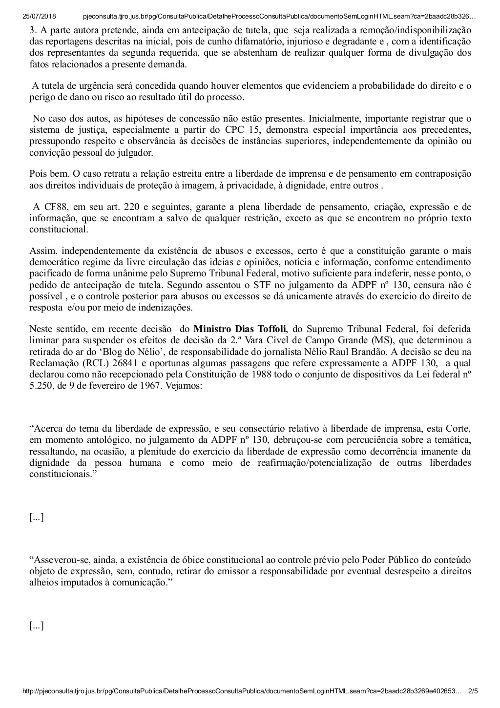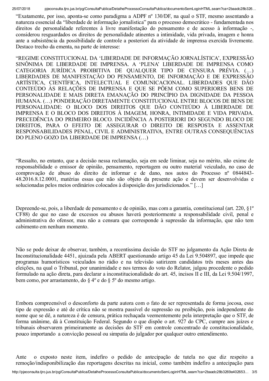 “[...] independentemente da existência de abusos e excessos, certo é que a constituição garante o mais democrático regime da livre circulação das ideias e opiniões, notícia e informação, conforme entendimento pacificado de forma unânime pelo Supremo Tribunal Federal, motivo suficiente para indeferir, nesse ponto, o pedido de antecipação de tutela. Segundo assentou o STF no julgamento da ADPF nº 130, censura não é possível , e o controle posterior para abusos ou excessos se dá unicamente através do exercício do direito de resposta e/ou por meio de indenizações”.