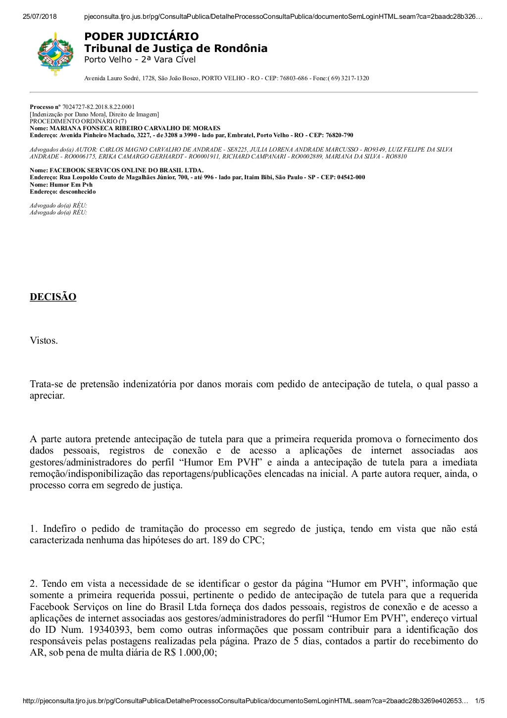 Por outro lado, atendeu ao pedido de atencipação de tutela a fim de solicitar à empresa Facebook Serviços on line do Brasil Ltda – também demandada na ação – que “forneça dos dados pessoais, registros de conexão e de acesso a aplicações de internet associadas aos gestores/administradores do perfil “Humor em PVH”.