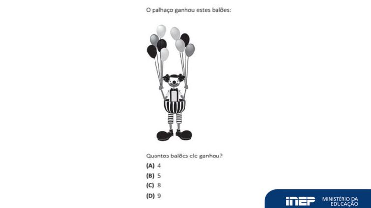 Uma prova mostra a figura de um palhaço segurando balões em ambas as mãos. O enunciado diz: “O palhaço ganhou esses balões. Quantos balões ele ganhou?”. A questão faz parte da última Avaliação Nacional da Alfabetização (ANA) aplicada a estudantes de 8 anos, no 3º ano do ensino fundamental em 2016. Duas a cada 10 crianças não conseguiram responder corretamente à questão, que exige apenas que se contem os nove balões da ilustração.