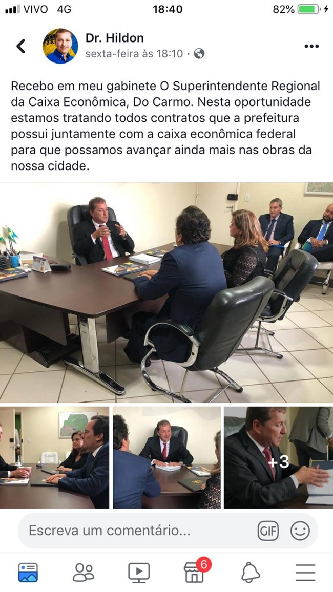 Na publicação da ultima sexta-feira (8), ás 18h10, o prefeito relata que recebeu no seu gabinete o “superintendente da Caixa Econômica Federal Do Carmo”. Segundo o prefeito a tratativa seria sobre contratos de município com a CEF e a aceleração das obras conjuntas.