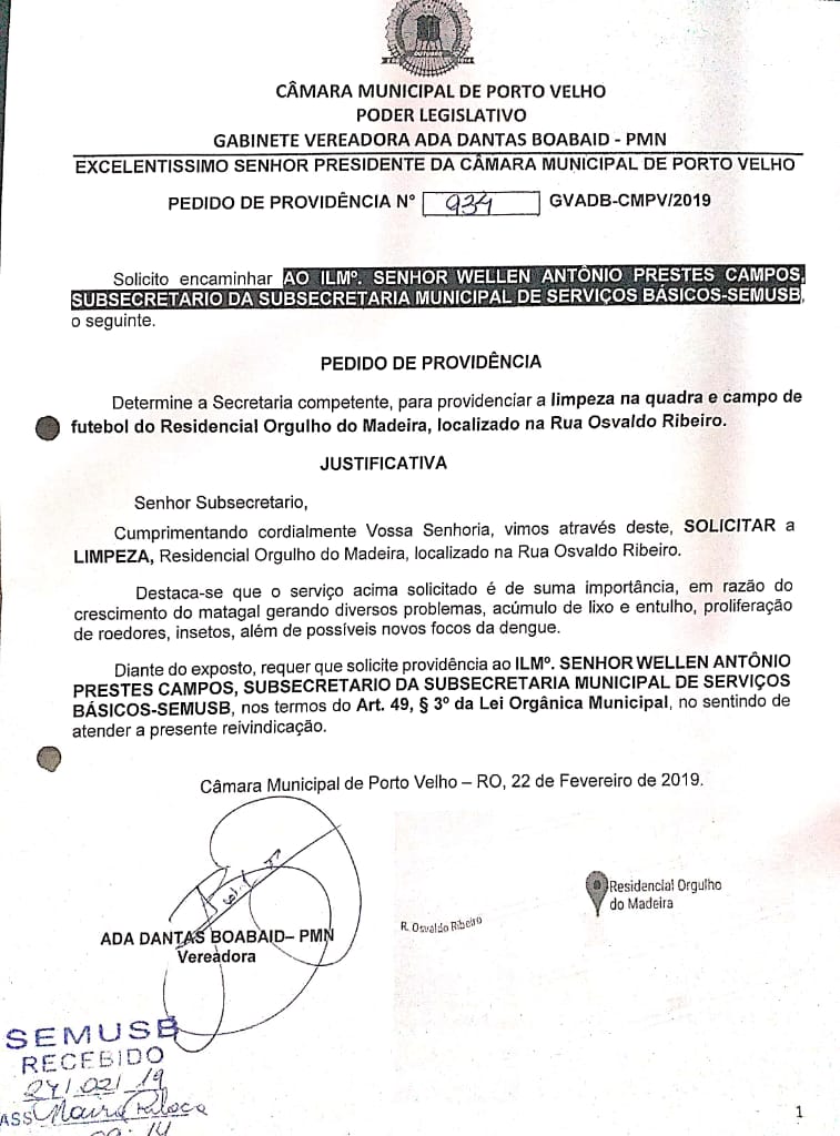 A Vereadora Ada Dantas Boabaid, (PMN) solicitou à Secretaria Municipal de Serviços Básicos (Semusb), limpeza da quadra e do campo de futebol, localizados na Rua Osvaldo Ribeiro, Residencial Orgulho do Madeira, Zona Leste de Porto Velho.