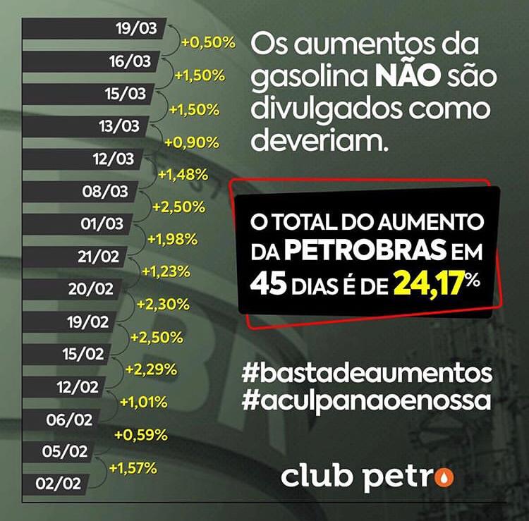 Circula pelas redes sociais um banner com informações que seriam sobre o reajuste da gasolina nos últimos 45 dias. As informações revelam os índices e o dia em que houve o aumento. No fim das contas a soma chega a 24,17%. O curioso é que o consumidor quase nem percebe esses aumentos porque eles variam de 0,50 a 2,50 por cento. Quem gastou, por exemplo, 400 reais em gasolina no mês passado pode ter pago, em média, 80 reais de reajuste.