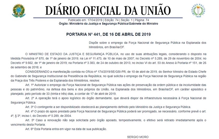 De acordo com a portaria, que atende a um pedido do Gabinete Institucional de Segurança da Presidência da República, a Força Nacional poderá ser utilizada “nas ações de preservação da ordem pública, da incolumidade das pessoas e do patrimônio, na defesa dos bens e dos próprios da União, na Esplanada dos Ministérios, em caráter episódico e planejado, pelo período de 33 dias, a contar de 17 de abril de 2019”.