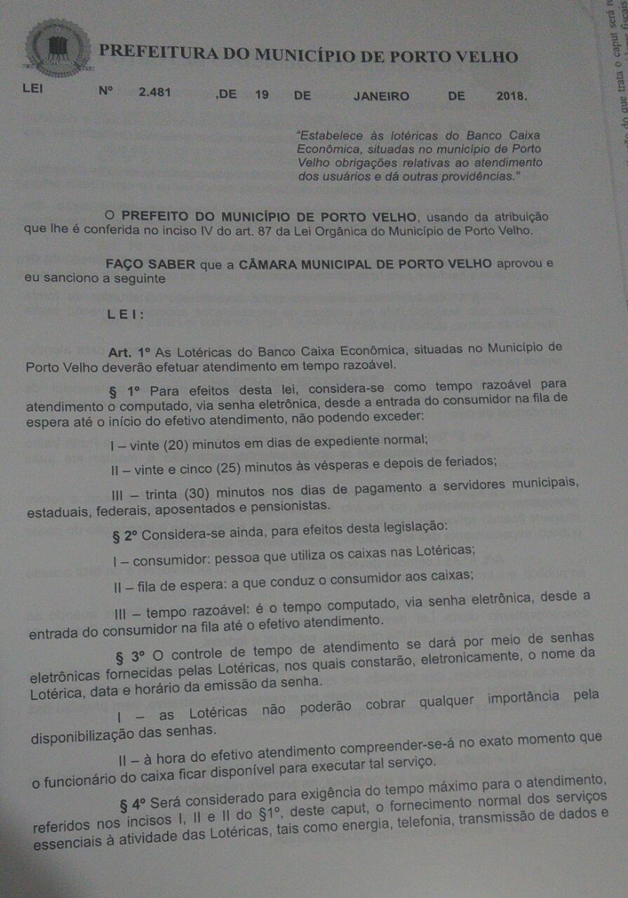 A Lei nº 2481 de 19 de janeiro de 2018 de autoria do vereador Júnior Cavalcante já está em vigor. Cabe a Semfaz supervisionar e cobrar o cumprimento, porém o vereador continua acompanhando se a lei esta sendo respeitada, a adequação das Lotéricas beneficia a população em geral.