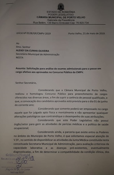 A comissão especial da Câmara Municipal de Porto Velho, com vistas à investidura dos cargos, dos aprovados no ultimo concurso, se reuniu ontem (22), no gabinete da Secretária Adjunta, da Secretaria Municipal de Administração (SEMAD), com a especial finalidade de solicitar apoio, da mesma, no sentido de disponibilizar junta médica, para avaliar clinicamente os aprovados no concurso, e em havendo necessidade de solicitar exames laboratoriais ou de imagens, para análise geral sob as condições de saúde dos confirmados, ou seja, declarando (o médico) o futuro servidor apto ou inapto, para tomar posse, disse Raimunda Waldete, presidente da comissão.