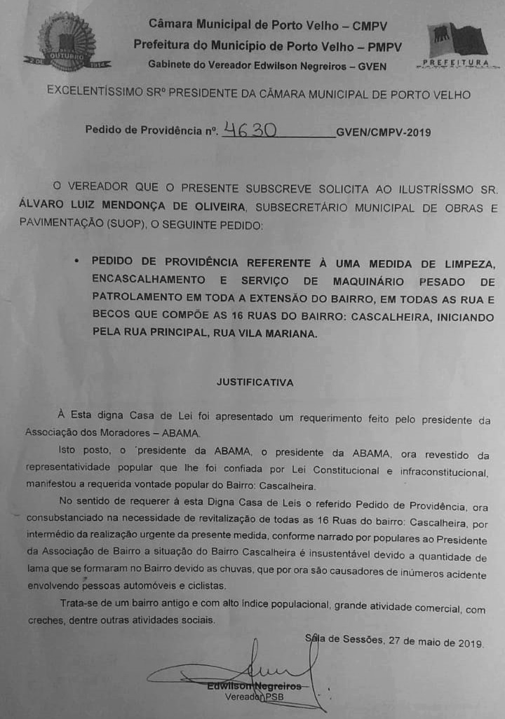 O vereador Edwilson Negreiros perpetrou pedido de providências, nº 4630, ao poder executivo no tocante a recuperação de rua no bairro Cascacalheira e como sempre foi atendido beneficiando sobremaneira a população do populoso bairro.