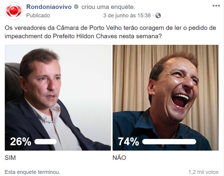 Uma enquete disponibilizada na página do Rondoniaovivo no Facebook nesta última terça-feira (4) indicou o desapontamento do cidadão portovelhense com a forma em Casa de Leis do município vem tratando as seguidas denuncias apresentadas contra o prefeito Hildon Chaves (PSDB) que pedem seu imediato afastamento.