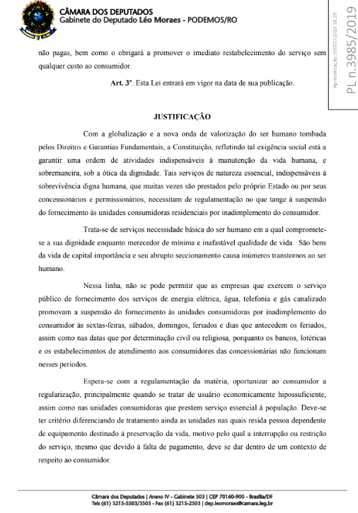 De autoria de Léo Moraes, o projeto dispõe a suspensão do fornecimento de energia elétrica, água, telefone e gás canalizado por falta de pagamento nos feriados, finais de semana e dias que antecedem essas datas.