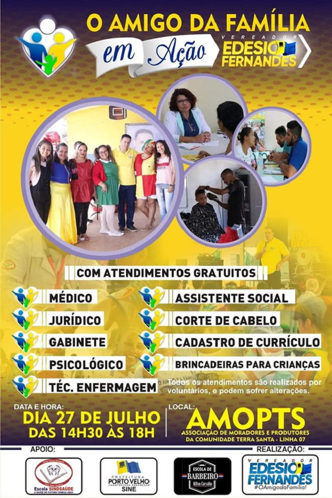 O vereador Edésio Fernandes realizará a primeira ação social na Terra Santa, sentido estrada da penal - setor chacareiro de Porto Velho, através da ajuda de vários voluntários. O evento acontecerá no sábado dia 27, ás 14:30h na Linha 7, na Associação de Moradores e Produtores da Comunidade Terra Santa.