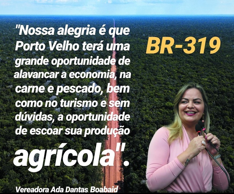 Ada Dantas destacou que ajudou na petição para que esta fosse assinada, incentivando para que Jair Bolsonaro olhasse com mais atenção para a BR-319. “Esta é uma grande conquista tanto para os povos de Rondônia e Amazonas, como para todo o país, afinal, ajudará no fomento do turismo. Com esta rodovia asfaltada facilitará o acesso pela Amazônia Brasileira, resultando em crescimento para ambos os estados”, concluiu Ada Dantas.
