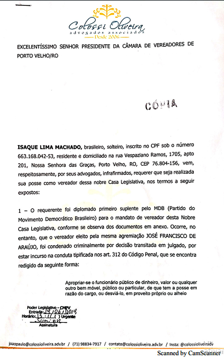 Essa ação foi movida pelo primeiro suplente de vereador, Isaque Lima Machado