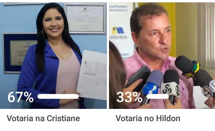 A pergunta foi direta: Em qual dos dois você votaria em uma disputa para prefeitura da capital rondoniense? Participaram da enquete 3.191 internautas, sendo que 67% deles votariam na vereadora Cristiane Lopes e 33% no atual prefeito Hildon Chaves.