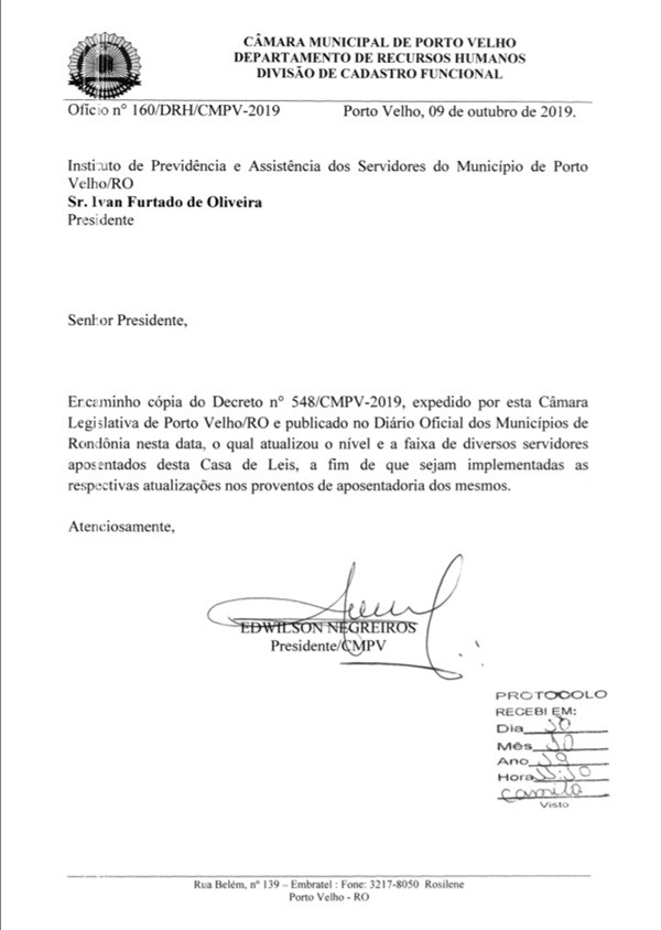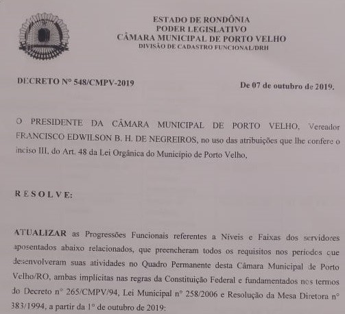 O presidente da Câmara Municipal de Porto Velho, vereador Edwilson Negreiros (PSB), em consonância com o regimento interno e a lei orgânica do município emitiu o decreto nº 548/CMPV/2019, conforme segue: