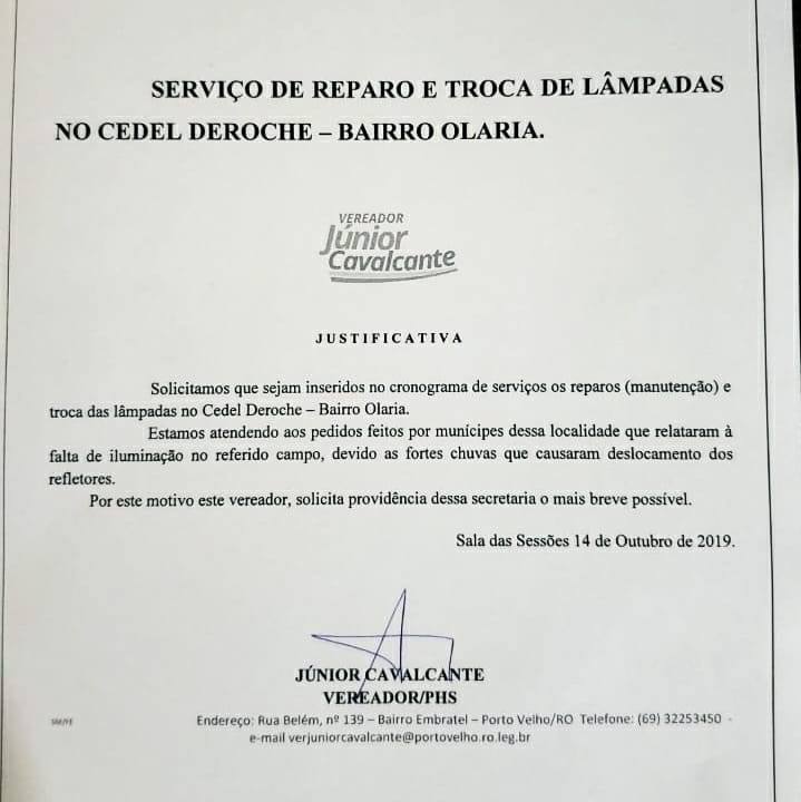 "Agradeço a EMDUR por atender mais um pedido de providência de nossa autoria, e garantir o reparo e troca de lâmpadas do Cedel DEROCHE, localizado no bairro Olaria, bem ao lado do ginásio Cláudio Coutinho. Espaço público importante para prática esportiva e atividades físicas da nossa população. Seguiremos trabalhando em prol da população de Porto Velho. Vamos em frente sempre", comentou o vereador Júnior Cavalcante.