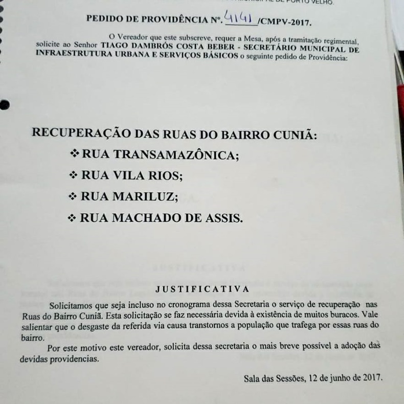 Estamos nesta luta desde 2017 correndo para levar benefícios para o bairro CUNIÃ, e não poderia deixar de agradecer ao executivo municipal por atender mais um pedido de providência de nossa autoria", comento o Vereador Júnior Cavalcante.