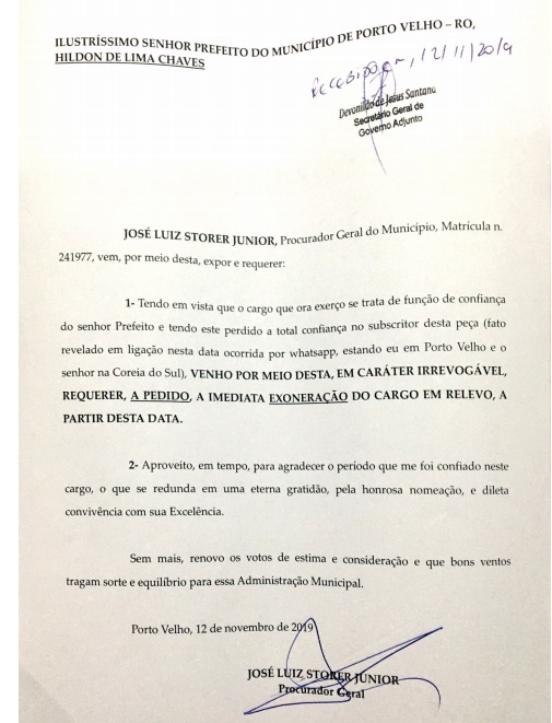 "Tendo em vista que o cargo que ora exerço se trata de função de confiança do senhor prefeito e tento este perdido a total confiança no subscritor desta peça (fato revelado nesta data ocorrida por whatsaap, estando eu em Porto Velho e o senhor na Coreia do Sul) venho por meio desta, em caráter irrevogável, requerer, a pedido, a imediata exoneração do cargo em relevo, a partir desta data”, disse Storer em um trecho de sua carta renúncia.