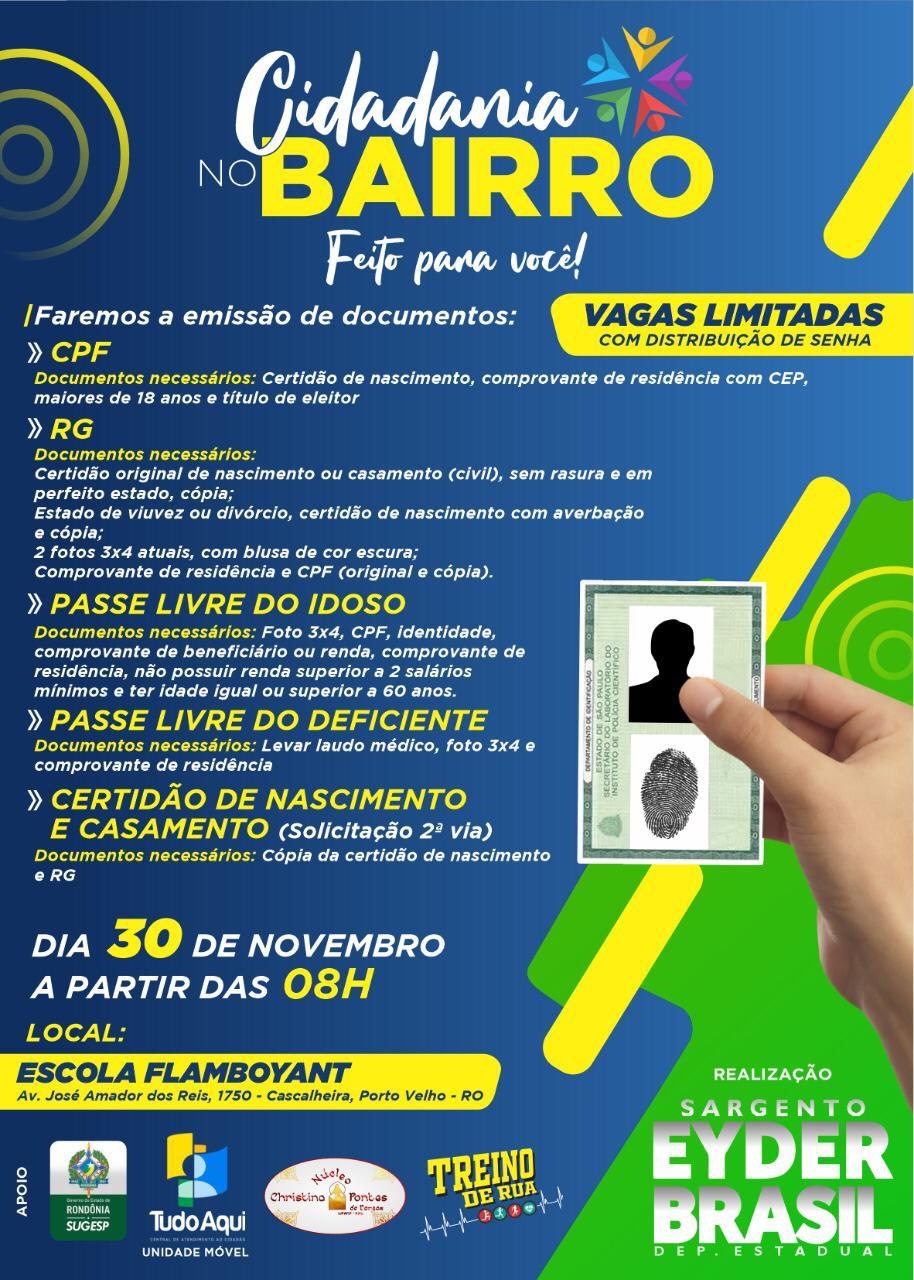 O projeto "Cidadania no Bairro" visa levar até a população atendimentos gratuitos, como a emissão de, RG, CPF, 2ª via da Certidão de Nascimento/Casamento, Passe Livre do Idoso/Deficiente, e atividades laborais.