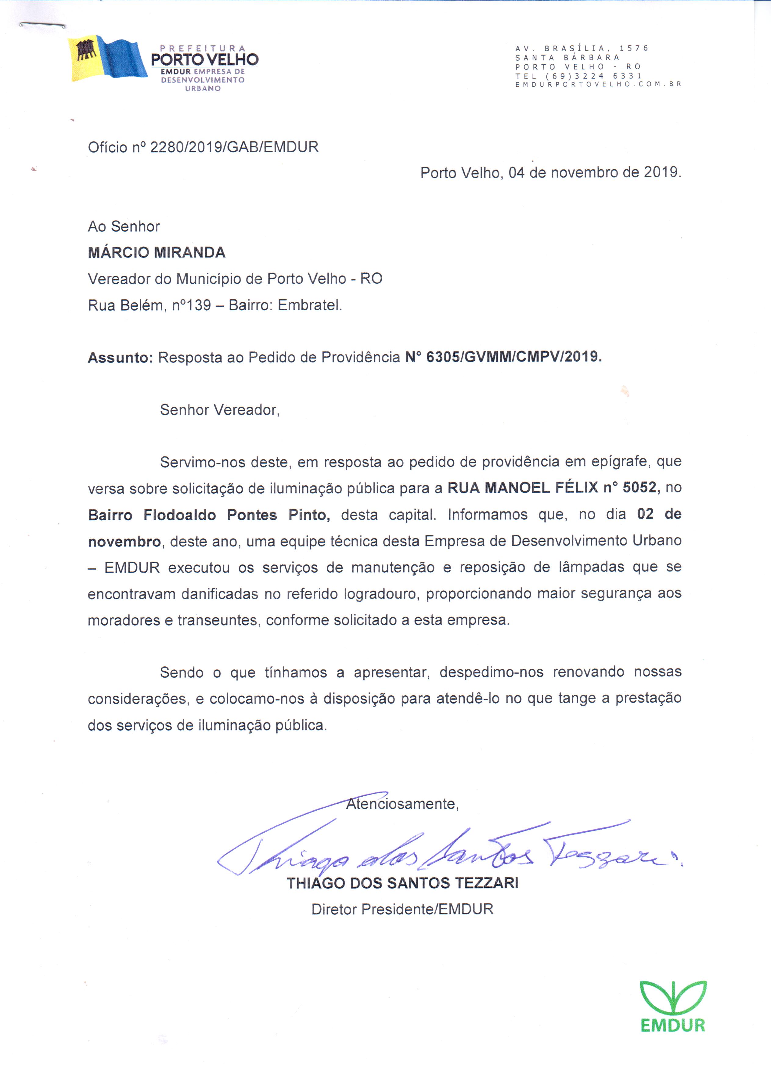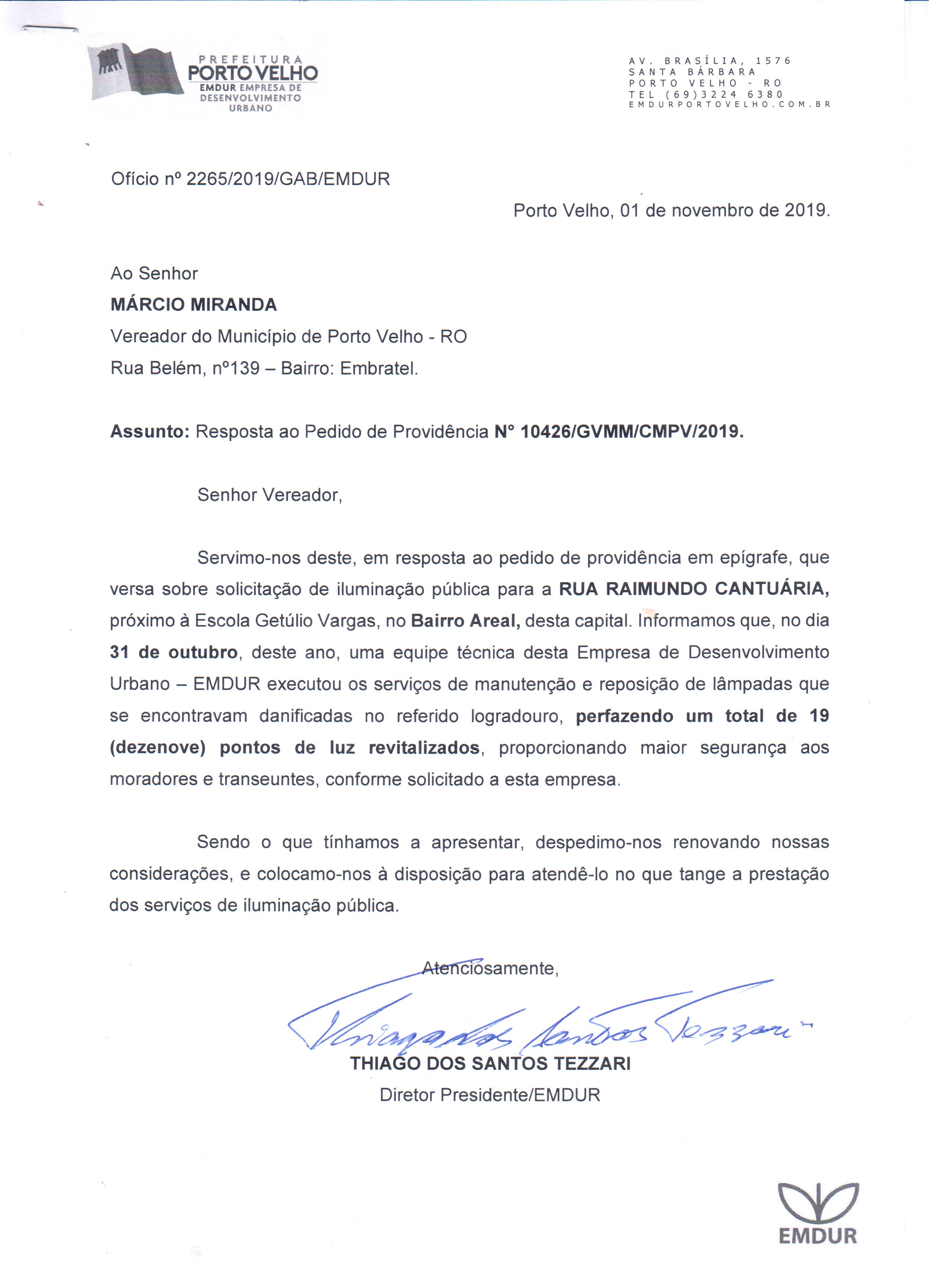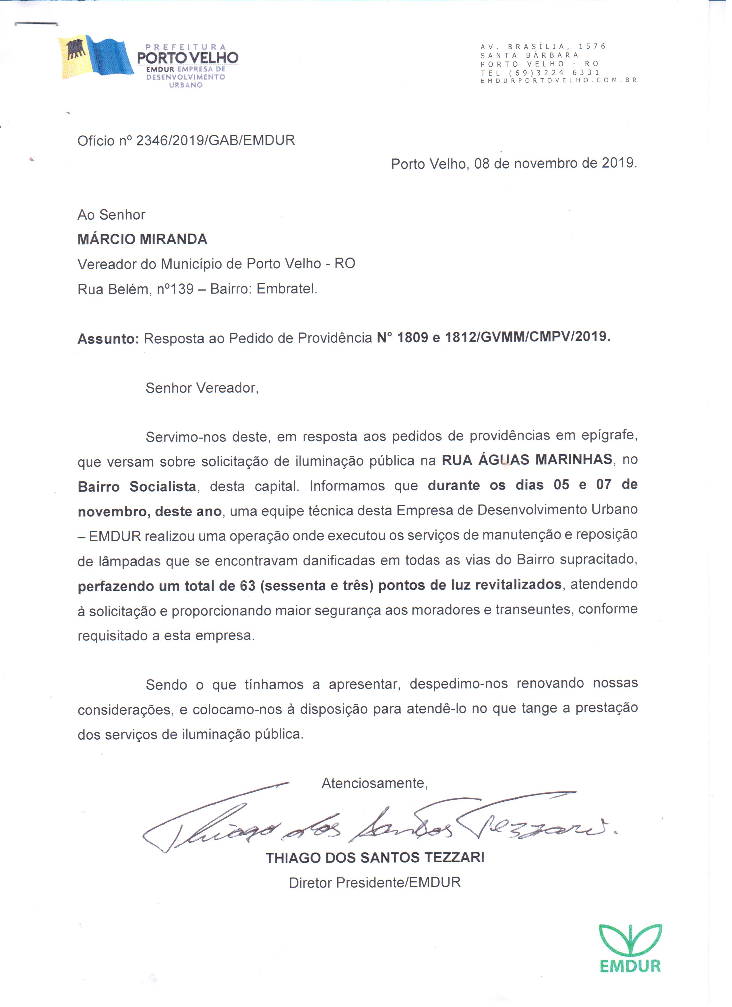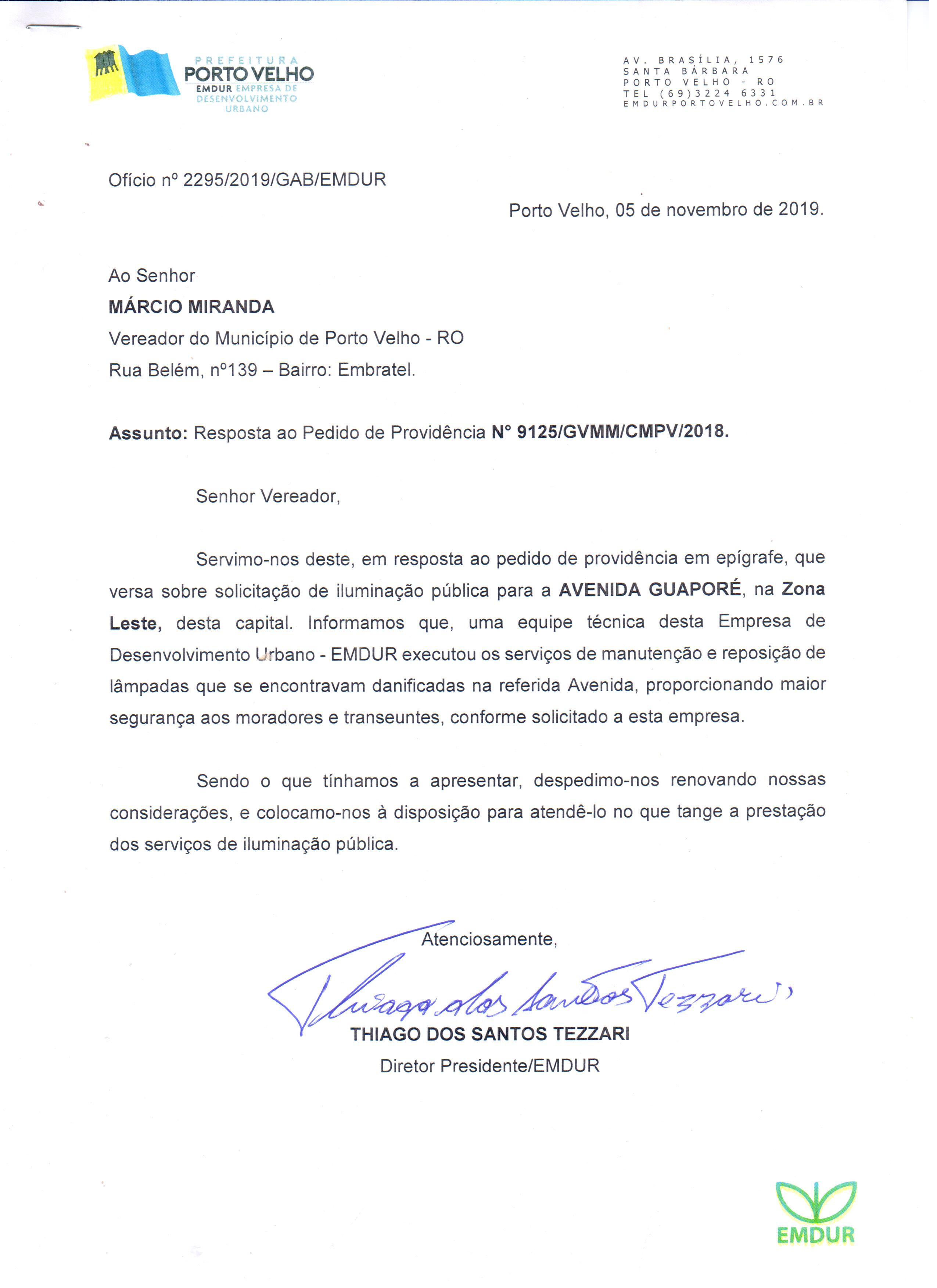 O Vereador Marcio Miranda por meio dos Pedidos de Providência nº 6305/10426/1809/1812/9125/GVMM/CMPV/2019, requereu com grau de URGÊNCIA à sua Excelência o Senhor Prefeito da capital Dr. Hildon de Lima Chaves, junto à Empresa de Desenvolvimento - EMDUR, o Serviço de Iluminação Pública de diversas ruas de Porto Velho.