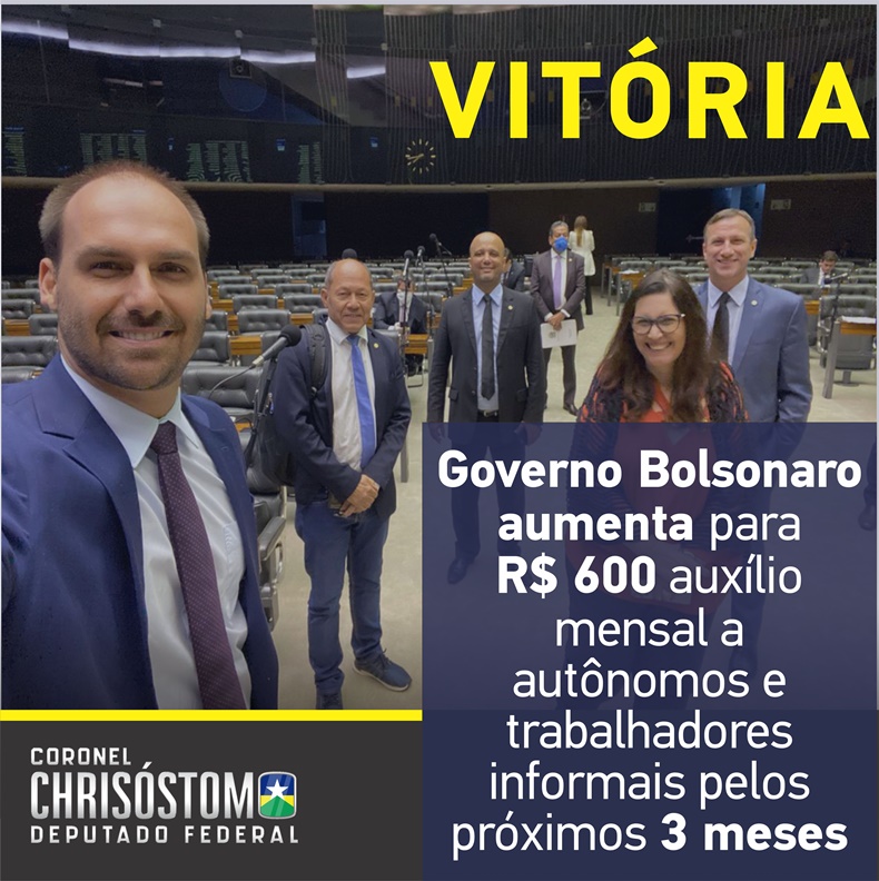 O valor final, muito superior aos R$ 200 anunciados pelo Executivo no início da crise em virtude da pandemia, foi possível após articulação de parlamentares do PSL com membros do governo federal.
