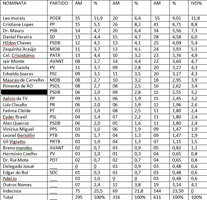 Os cinco primeiros nomes são do deputado federal Léo Moraes, com 11,8% das intenções de votos, seguido pela vereadora Cristiane Lopes, com 8,8%, o deputado federal Mauro Nazif, com 7,3%, o ex-governador Daniel Pereira, com 6,0%, e o atual prefeito Hildon Chaves, com 5,4%.