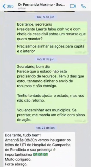 Expondo as mensagens, o Senador cobrou de Marcos Rocha a demissão de Fernando Máximo, que ele considerou como “secretário da Saúde de Porto Velho”, alegando que, ou o governador está mentindo ou a sua equipe não serve para estar ao seu lado.