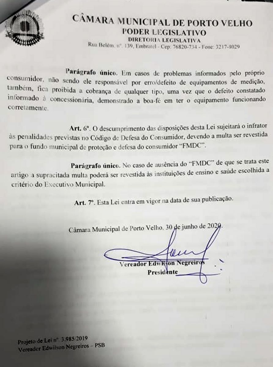 Sem a sanção do alcaide, Negreiros promulgou as leis da merenda e também a que proíbe concessionárias de luz, água e gás de patrocinarem cobranças por estimativa.