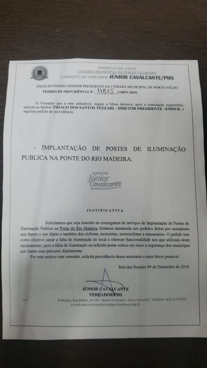 O vice-presidente da câmara, Vereador Júnior Cavalcante, está atento as demandas da população de Porto Velho que vinha reclamando com frequência da falta de iluminação pública na ponte do Rio Madeira.