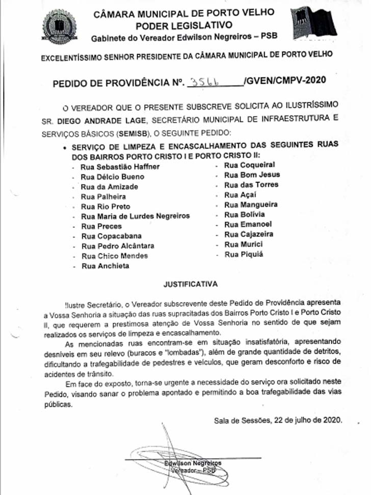 O pedido foi feito pelo vereador Edwilson Negreiros que tem sido um dos grandes parceiros daquelas comunidades em seu mandato. Para ele, a parceria com a Prefeitura tem garantido a execução de obras de relevância em toda a cidade a pedido dos vereadores.