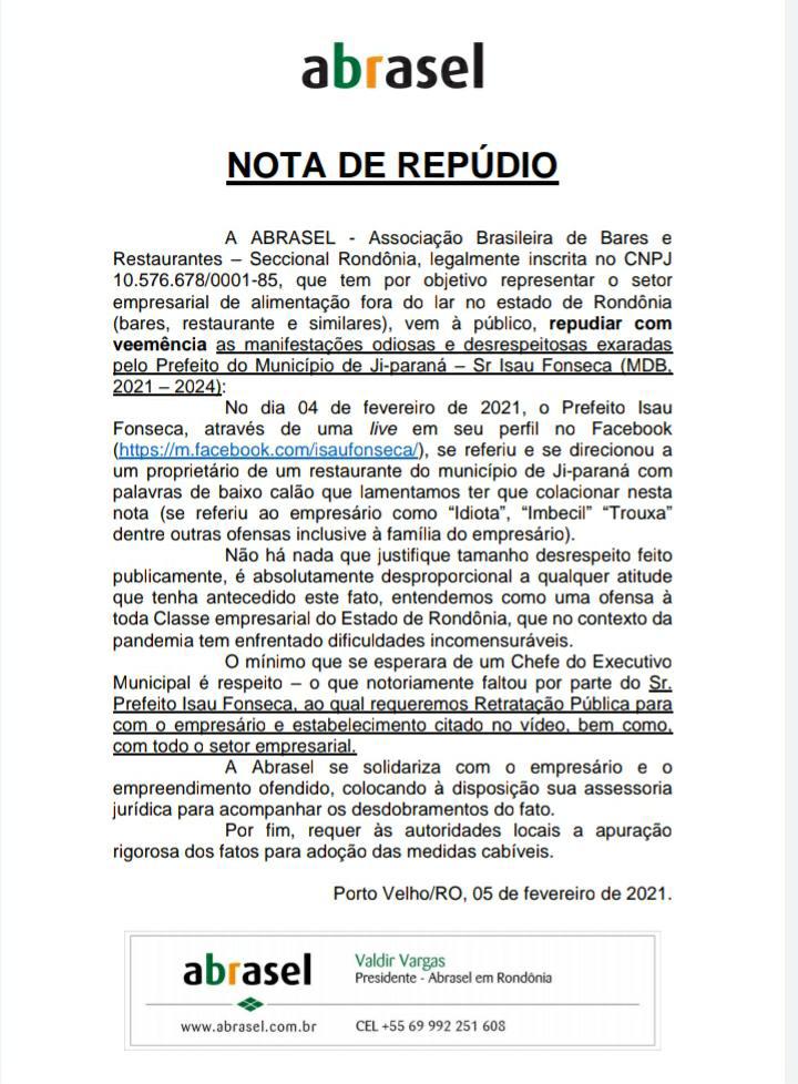 A ABRASEL emitiu uma nota de repúdio ao prefeito de Isaú Fonseca.