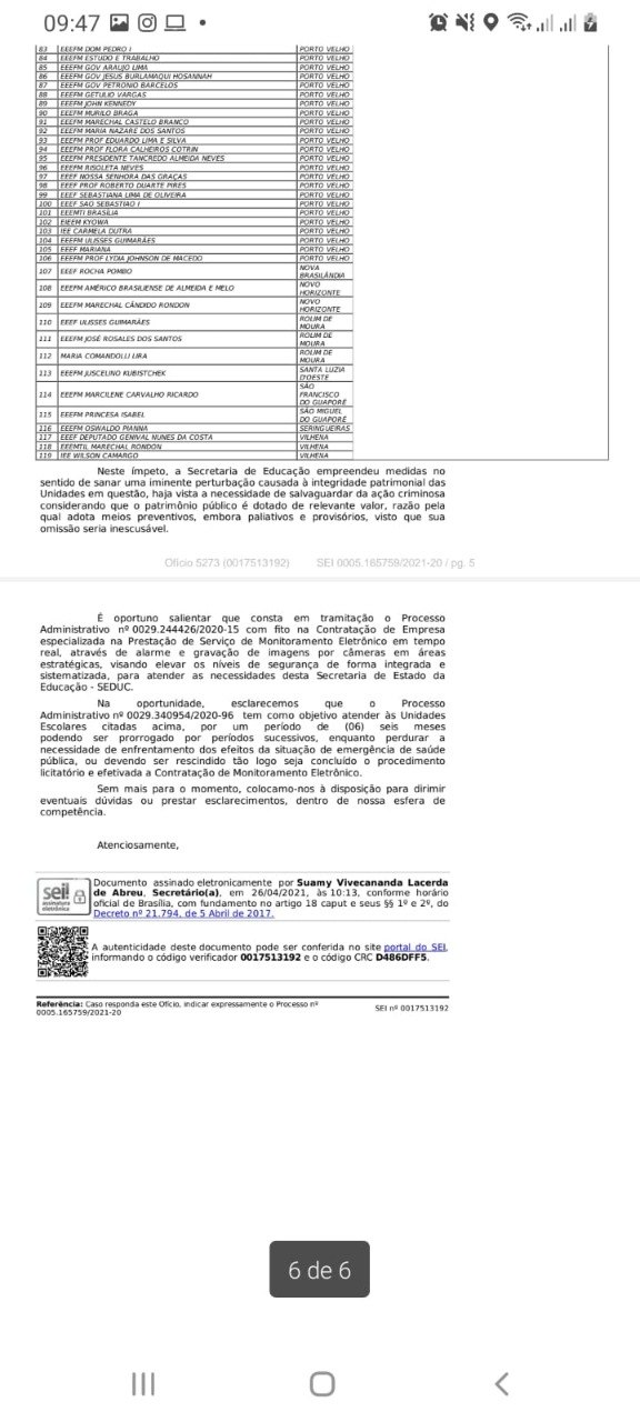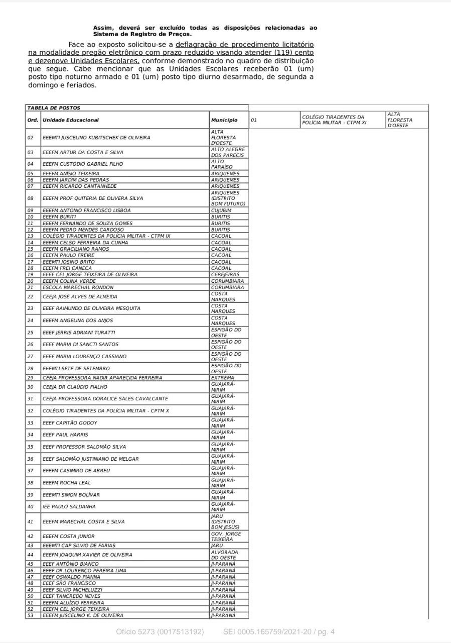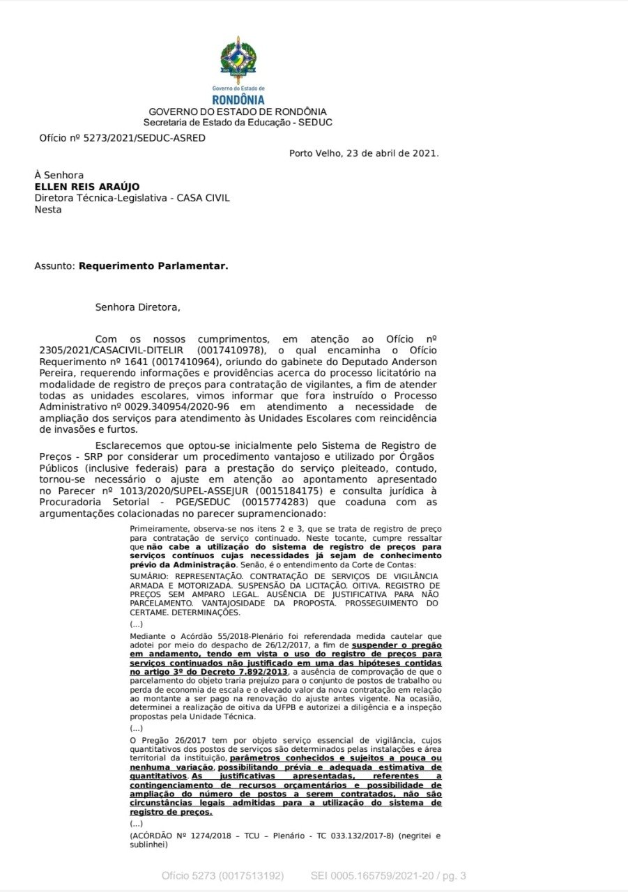 Atendendo mais um pedido feito pelo deputado estadual Anderson Pereira (PROS), o governo do estado de Rondônia, através da Secretaria Estadual de Educação (Seduc), encaminhou ao gabinete do parlamentar, ofício 5273/2021/SEDUC-ASRED, informando que um processo licitatório foi instaurado para contratação imediata de 238 vigilantes para atuarem nas escolas estaduais em Rondônia.