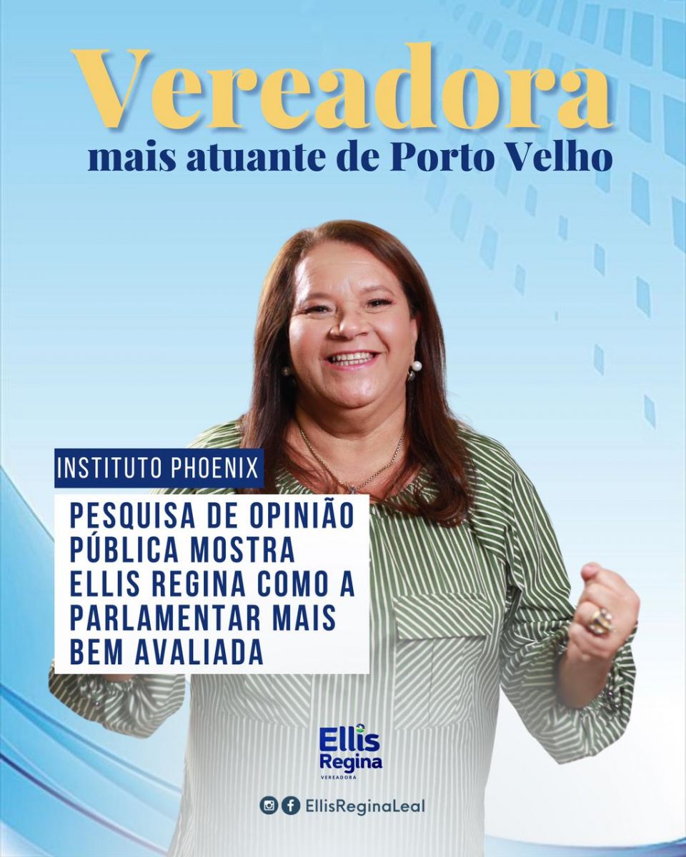 A vereadora Ellis Regina (Podemos) agradeceu nesta terça-feira 13.07 o apoio recebido pelos cidadãos que a escolheram como a legisladora mais atuante da Câmara Municipal de Porto Velho, conforme divulgado na última sexta-feira pelo Rondoniaovivo. Segundo Ellis, o reconhecimento é um prêmio pelos trabalho já realizado ao longo de seus quatro mandatos como vereadora.