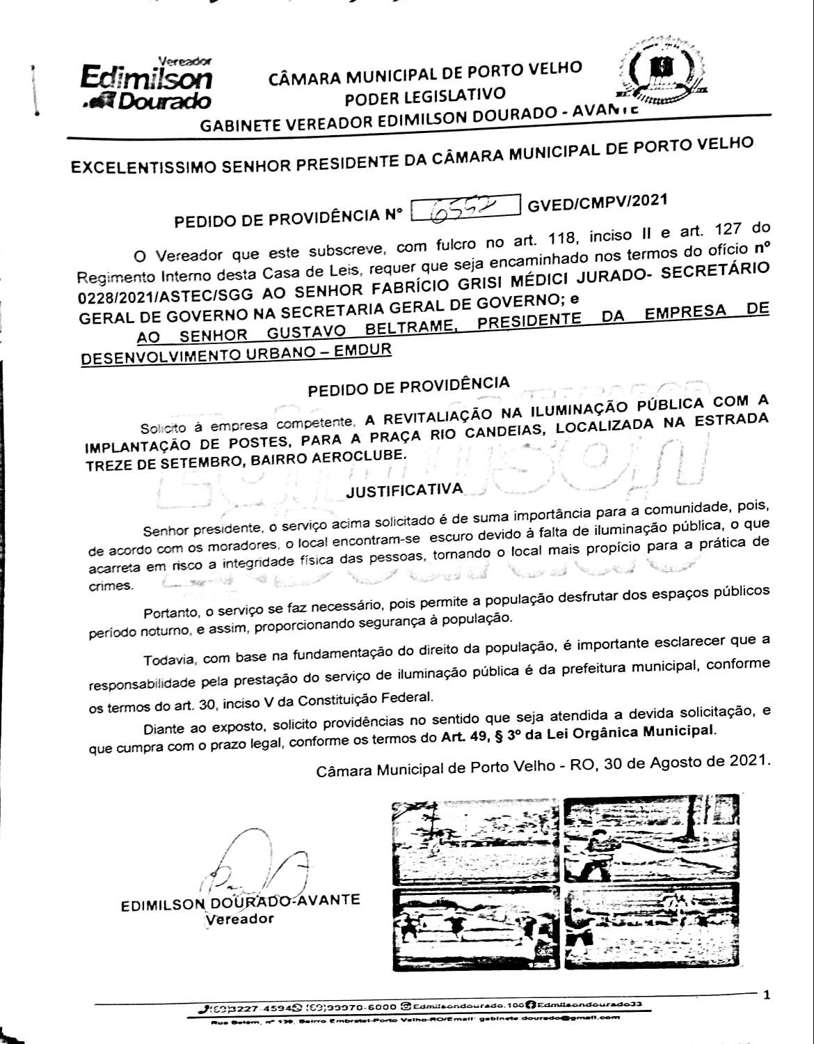 Em atendimento à solicitação do vereador Edimilson Dourado (Avante), servidores da Empresa Municipal de Desenvolvimento Urbano (Emdur), iniciaram os trabalhos para revitalizar a iluminação pública na Praça Rio Candeias, no Bairro Aeroclube, zona sul de Porto Velho.