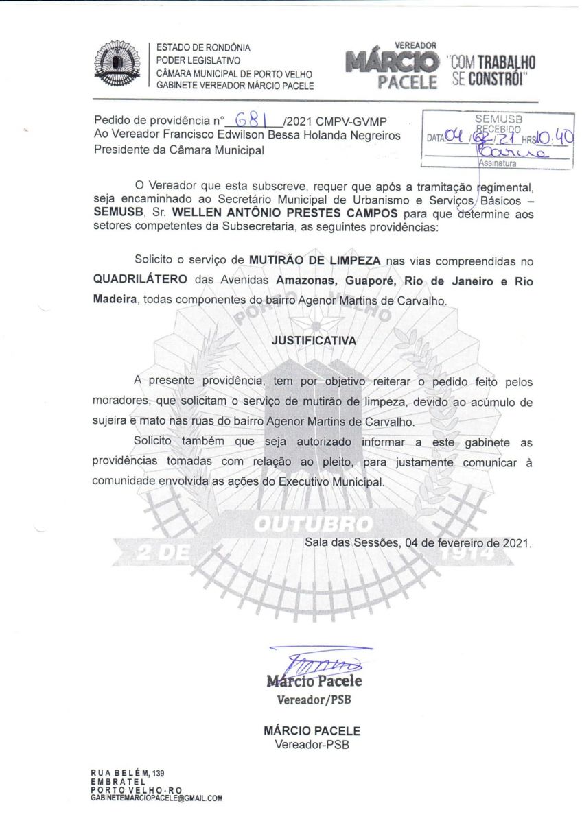 Atendendo a um pedido de providencia do vereador Márcio Pacele (PSB), a Prefeitura de Porto Velho, por meio da Secretaria Municipal de Serviços Básicos (SEMUSB), iniciou na manhã desta segunda-feira (7), serviço de Mutirão de Limpeza em todo o Bairro Agenor de Carvalho.