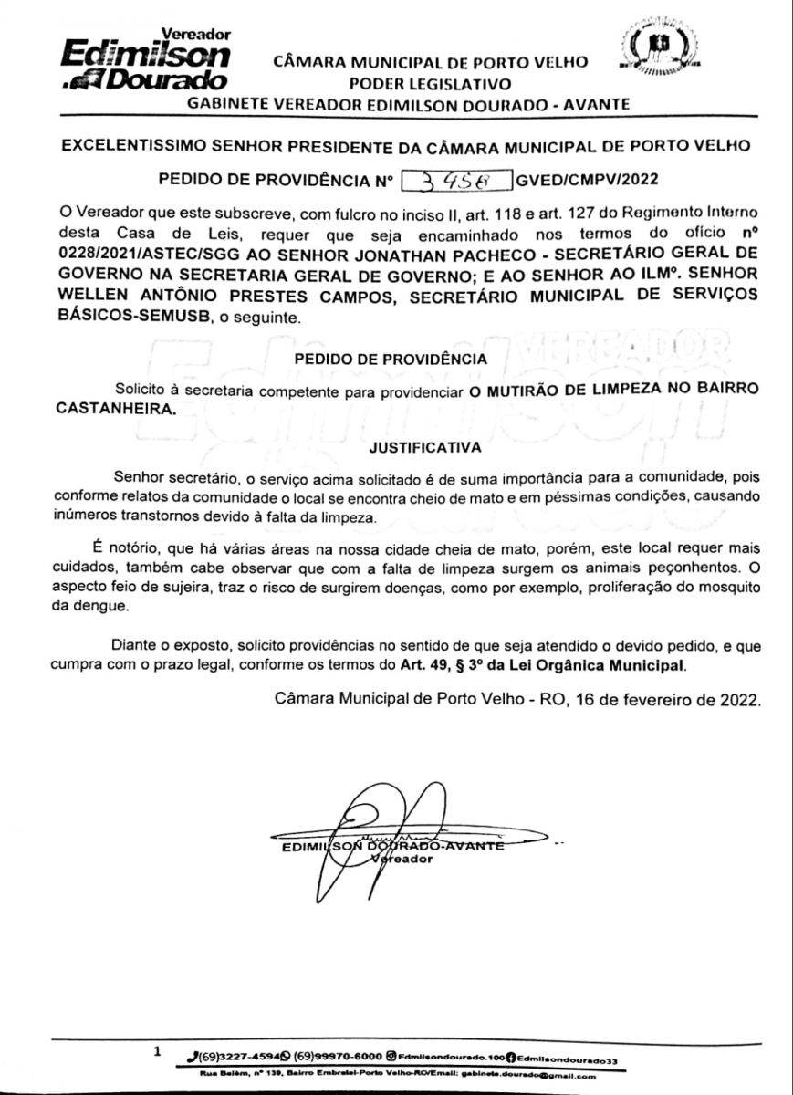 Através do Pedido de Providência nº 3.458, o parlamentar solicitou ao secretário da Semusb, Wéllem Prestes, o mutirão de limpeza para o bairro, visando recuperar diversas ruas da localidade. As vias estavam com acúmulo de mato e lixo, o que facilitava o aparecimento de animais peçonhentos.