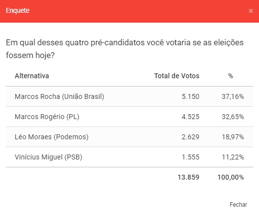 Quatro nomes foram colocados na enquete: Marcos Rocha (União Brasil), Léo Moraes (Podemos), Marcos Rogério (PL) e Vinícius Miguel (PSB).